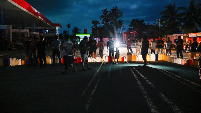 Diketahui, sejak terjadinya bencana banjir dan tanah longsor, yang diikuti dengan pemadaman listrik yang melanda sebagian besar wilayah Aceh, kebutuhan konsumsi BBM meningkat tajam. Tampak dalam foto, warga terdampak banjir mengantre untuk mendapatkan bahan bakar di sebuah Stasiun Pengisian Bahan Bakar Umum (SPBU) di Samahani, Provinsi Aceh, pada 2 Desember 2025. (CHAIDEER MAHYUDDIN/AFP)